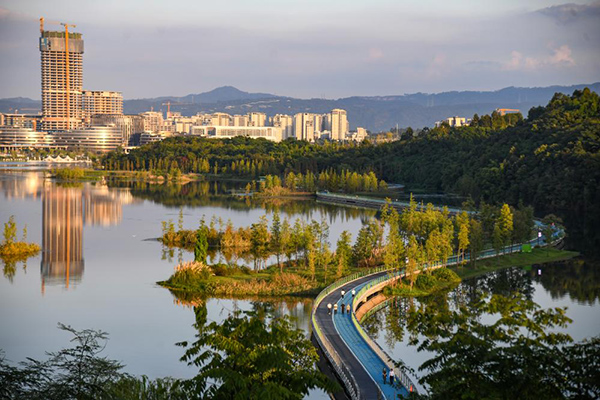 2024年10月17日,人们在四川天府新区兴隆湖湖中绿道上散步。新华社记者 王曦 摄